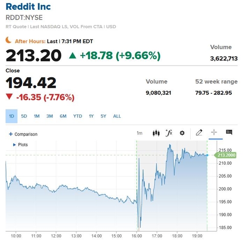 레딧은 실적 호조와 시장의 예상치를 뛰어넘는 가이던스 제시에 힘입어 시간외 거래에서 정규장 대비 18.78달러(9.66%) 오른 213.20달러에 거래됐다.