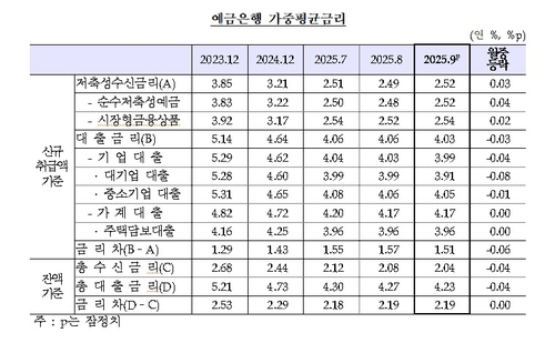 31일 한국은행이 발표한 '2025년 9월 중 금융기관 가중평균금리'에 따르면 9월 예금은행의 신규취급액 기준 가계대출 금리는 4.17%로 전월과 같았다.
