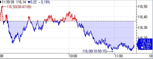10년 국채선물은 24틱 하락한 116.36을 기록했다. 외국인이 약 1천700계약 팔았고, 증권이 700계약가량 매수했다.