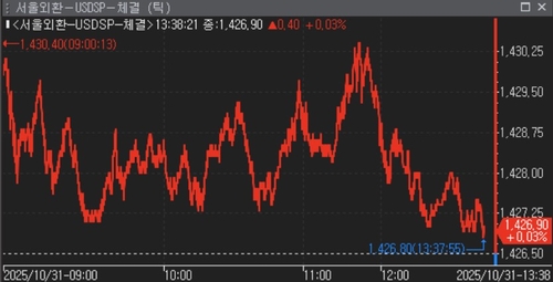 31일 서울 외환시장에서 달러-원 환율은 오후 1시38분 현재 전장대비 0.40원 오른 1,426.90원에 거래됐다.
