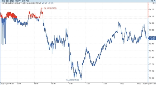 31일 연합인포맥스(화면번호 6411)에 따르면 달러-엔 환율은 오후 2시33분 현재 전일 대비 0.10% 하락한 하락한 153.940엔을 기록하고 있다.