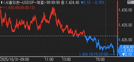 31일 서울외환시장에서 달러-원 환율은 오후 3시 30분 기준으로 전날 대비 2.10원 내린 1,424.40원에 정규장 거래를 마쳤다.