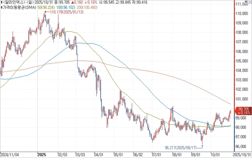 연합인포맥스의 달러인덱스 및 이종통화 등락률 비교(화면번호 6400번, 6443번)에 따르면, 지난달 31일(이하 현지시간) 기준 주요 6개국 통화에 대한 달러화 가치를 나타내는 달러인덱스(DXY)는 전주대비 0.769포인트(0.78%) 높은 99.705에 거래를 끝냈다.