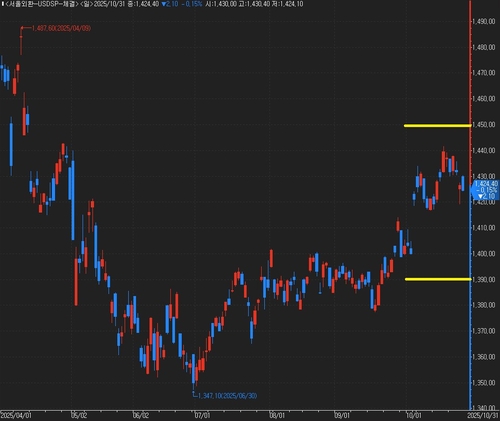 달러-원 환율은 10월 마지막 거래일에 1,424.40원으로 정규장을 마쳤는데 위로 약 25원, 아래로 35원 정도 움직일 수 있다는 판단이다.