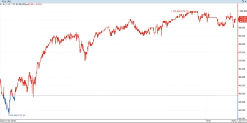 3일 연합인포맥스 종목 시세(화면번호 3111)에 따르면 두산의 주가는 이날 오전 9시55분쯤 100만원의 장중 고점을 기록했다. 전일 대비 5.37% 오른 수준이다. 이후 99만5천원 내외에서 등락 중이다.