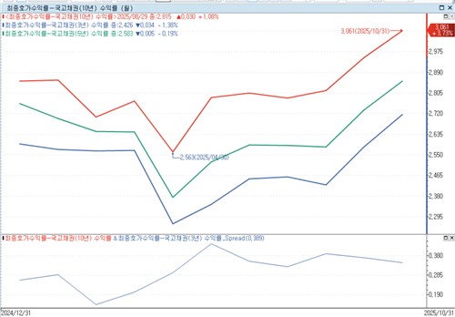 3일 연합인포맥스 '종합화면'(화면번호 5000)에 따르면 지난달 말 기준 국고채 3년물 최종호가수익률은 전월 대비 13.4bp 오른 2.715%를 기록했다.