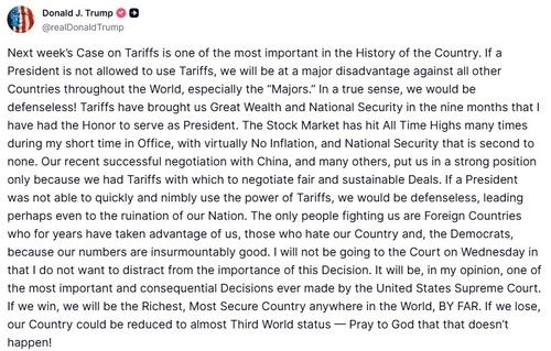 트럼프 대통령은 "대통령이 관세라는 힘을 신속하고 민첩하게 사용하지 못한다면, 우리는 무방비 상태가 될 것이며, 심지어 국가 파탄으로 이어질 수도 있다"고 말했다.