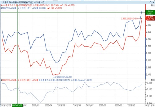 증권사의 한 채권 딜러는 "보험사 수요가 덜한 분위기인 데다 11월치고 수량이 많은 편"이라며 "PD들이 국고채 30년물을 받은 후 시장에 헤지를 하는 과정에서 시장 금리가 오르는 상황이 발생할 수 있어 보인다"고 말했다.