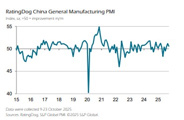 레이팅도그의 야오 유 창립자는 "수요와 생산 모두 확장이 10월에 둔화됐으며, 신규 수출 주문이 위축 구간으로 떨어졌다"고 설명했다.