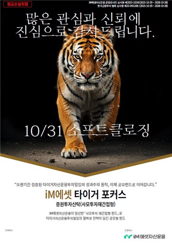 3일 iM에셋자산운용은 지난달 29일 출시한 'iM에셋 타이거 포커스 증권투자신탁(사모투자재간접형)'이 사흘 만에 1천824억 원의 수요를 모으면서 소프트클로징(Soft Closing)했다고 밝혔다.