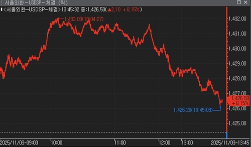 3일 서울 외환시장에서 달러-원 환율은 오후 1시45분 현재 전장대비 2.10원 오른 1,426.50원에 거래됐다.