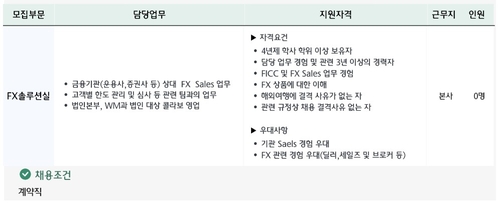 4년제 학사 학위 이상 보유자 중 FICC·FX세일즈 업무 경험이 있고, FX상품에 대한 이해를 갖춘 자로 한정한다. 3년 이상의 관련 경력이 필요하다.