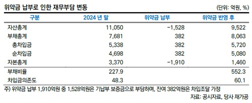 그러면서 "지난해 말 재무지표에 위약금 납부 영향 반영 시 부채비율과 차입금의존도는 각각 227.9%, 48.3%에서 552.3%, 60.1%로 크게 저하된다"고 분석했다.