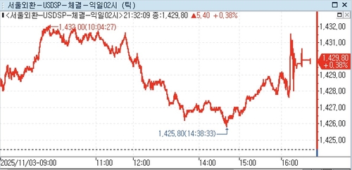 3일 외환시장에서 달러-원 환율은 오후 9시 32분 현재 전장 대비 5.40원 상승한 1,429.70원으로 나타났다.