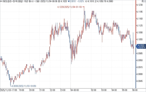 연합인포맥스의 해외금리 일중 화면(화면번호 6532)에 따르면 3일(미국 동부시간) 오후 3시 현재 뉴욕 채권시장에서 10년물 국채금리는 직전 거래일 오후 3시 기준가 대비 0.80bp 오른 4.1080%에 거래됐다.
