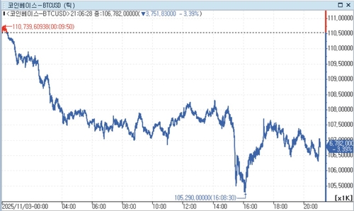 4일 연합인포맥스(화면번호 2521)에 따르면 비트코인 가격은 오전 6시 19분 현재 24시간 전보다 3.75% 하락한 106,390.01달러에 거래되고 있다. 미국 시장 시간대인 이날 새벽 비트코인 가격은 4% 이상 급락하며 105,290.00달러까지 저점을 낮추기도 했다.