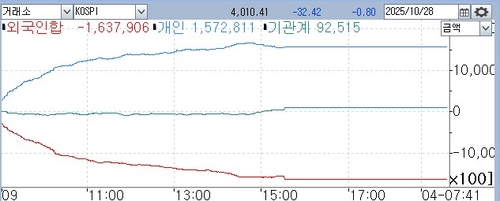 이날은 외국인과 기관이 모두 각각 1조6천억 원, 925억 원 순매도한 날이었지만, 개인투자자의 힘으로 코스피는 4,010.41로 전일 대비 0.80% 소폭 하락하는 데 그쳤다.