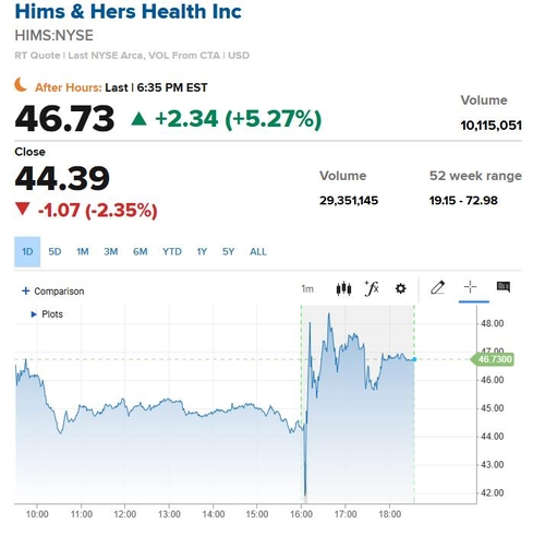 (서울=연합인포맥스) 이장원 선임기자 = 원격 진료 플랫폼 힘스 앤드 허스 헬스(NYS:HIMS)는 3분기에 시장의 예상치를 뛰어넘는 실적을 발표했다.