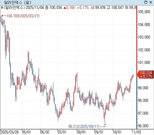 4일 오전 10시 31분 현재 주요 6개 통화에 대한 달러 가치를 반영하는 미국 달러 지수는 전장대비 0.17% 오른 100.03으로, 3개월 만에 최고치이자 3개월 만에 처음으로 100을 상향 돌파했다.