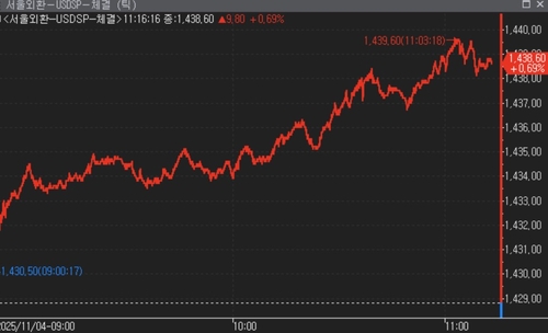 4일 서울 외환시장에서 온라인카지노 바로가기-원 환율은 오전 11시16분 현재 전장대비 9.80원 오른 1,438.60원에 거래됐다.