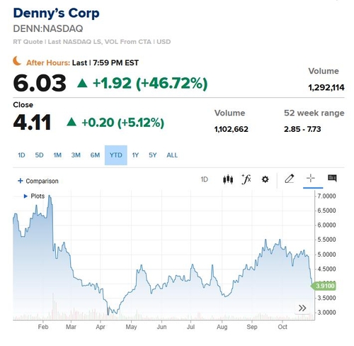 데니스 주가는 시간 외 거래에서 1.92 달러(46.72%) 오른 6.03달러에 거래됐다.