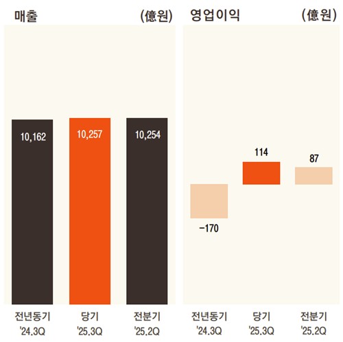 매출은 전년 동기 대비 0.9% 늘었고, 영업이익은 흑자 전환했다. 지난 분기에 이어 이번 분기에도 영업이익은 흑자 추세를 이어가는 중이다.