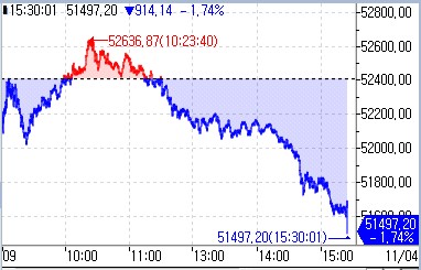 연합인포맥스 세계주가지수(6511)에 따르면 닛케이225 지수는 전 거래일 대비 914.14포인트(1.74%) 내린 51,497.20, 토픽스 지수는 21.69포인트(0.65%) 낮은 3,310.14에 각각 거래됐다.