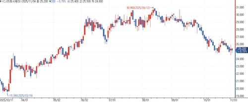전날 CJ프레시웨이 주가는 전장 대비 0.79% 내린 2만5천200원에 장을 마감했다. 증권가는 최근 1개월간 CJ프레시웨이 목표주가를 평균 3만9천500원으로 제시했다.