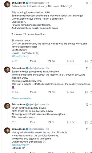 잭슨 대표는 별도의 게시물에서 지금이 인공지능(AI) 거품이 아니라며 강세장이 2032년까지 이어질 것이라고 전망했다.