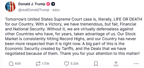 (서울=연합인포맥스) 김지연 기자 = 도널드 트럼프 미국 대통령은 오는 5일 자신이 추진해 온 관세 정책의 적법성을 판단할 연방대법원 재판을 앞두고 "미국의 생사가 걸린 문제"라고 밝혔다.
