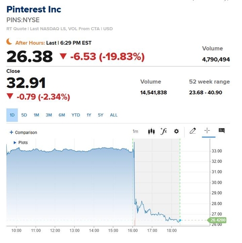 4일(미국 현지시각) 핀터레스트는 정규장 대비 6.53달러(19.83%) 내린 26.38달러에 거래됐다.