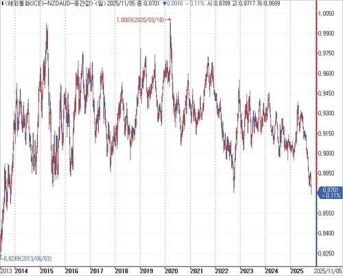 뉴질랜드달러는 미국 달러 대비 0.1% 중반대의 하락률을 보이고 있다. 뉴질랜드달러-호주달러 환율은 0.87호주달러 부근까지 밀려나며 2013년 이후 12년 만의 최저치를 경신했다.