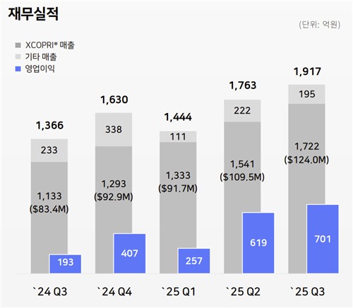 3분기 엑스코프리 매출은 1천722억 원을 달성하며 전 분기 대비 12%, 전년 동기 대비 52% 늘었다. 지난 7월부터는 월간 처방 수가 4만 건을 넘어 전년 대비 증가 폭이 25% 이상 상승했다고 설명됐다.