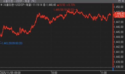 5일 서울 외환시장에서 달러-원 환율은 오전 11시19분 현재 전장대비 10.50원 급등한 1,448.40원에 거래됐다.