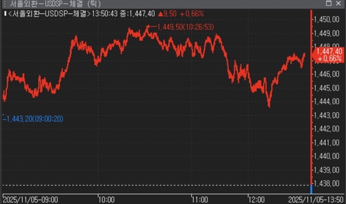 5일 서울 외환시장에서 오후 1시50분 현재 달러-원 환율은 전장대비 9.50원 오른 1,447.40원에 거래됐다.