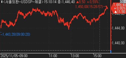 이후 1,440원 후반대에서 횡보하다가 정규장 마감 직전 1,450.00원을 터치하고 장을 끝냈다.