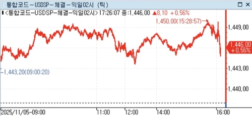 5일 외환시장에서 달러-원 환율은 오후 5시 21분 현재 전일대비 7.60원 오른 1,445.50원에 거래됐다.