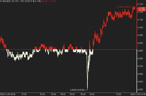 연합인포맥스의 해외금리 일중 화면(화면번호 6532)에 따르면 5일(미국 동부시간) 오전 9시 7분 현재 뉴욕 채권시장에서 10년물 국채금리는 직전 거래일 오후 3시 기준가보다 2.30bp 오른 4.113%를 기록했다.