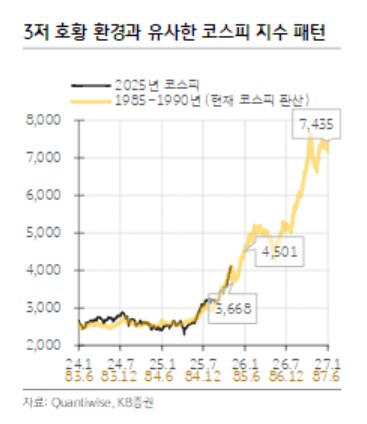 KB증권은 내년 코스피 목표로 5,000을 제시하면서, 특히 장기 강세장 시나리오에서는 7,500까지 상승할 수 있다고 전망했다.