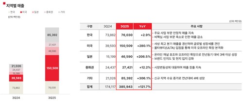 이외 일본 매출은 전년 동기 대비 206.5% 증가한 466억 원, 기타 매출은 같은 기간 306.1% 증가한 854억 원을 기록했다.