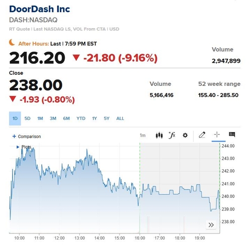 도어대시는 시간외 거래에서 정규장 대비 21.80달러(9.16%) 하락한 216.20달러에 거래됐다.