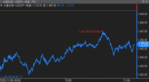 6일 서울 외환시장에서 달러-원 환율은 오전 11시23분 현재 전장대비 3.90원 내린 1,445.50원에 거래됐다.
