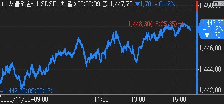 장중 고점은 1,448.30원, 저점은 1,442.00원으로 장중 변동 폭은 6.30원이다.