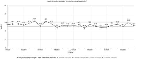 6일(현지시간) 웨스턴 온타리오 대학교의 아이비 경영대학원에 따르면 10월 캐나다의 제조업 구매관리자지수(PMI)는 계절 조정 기준으로 52.4로 전달(59.8) 대비 7.4포인트 급락했다.