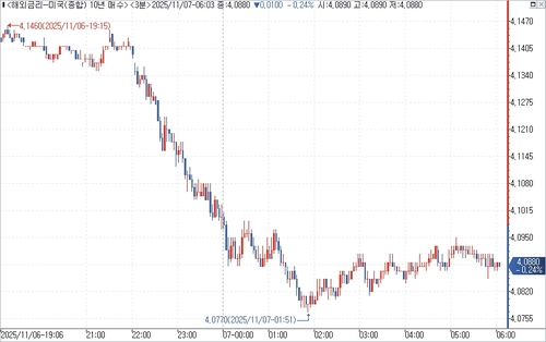 연합인포맥스의 해외금리 일중 화면(화면번호 6532)에 따르면 6일(미국 동부시간) 오후 3시 현재 뉴욕 채권시장에서 10년물 국채금리는 전 거래일 오후 3시 기준가 대비 6.50bp 내린 4.0920%에 거래됐다.