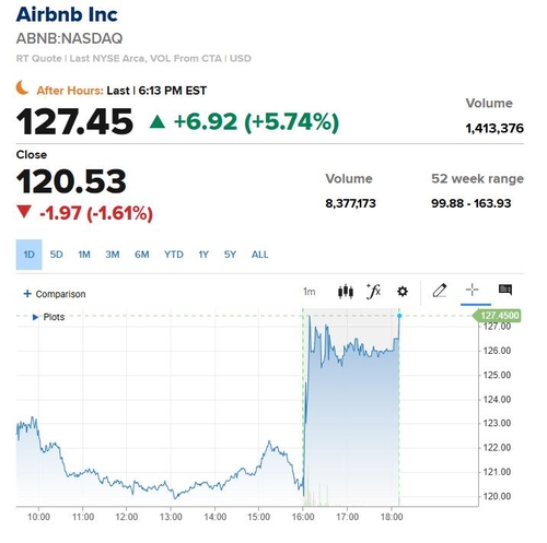 에어비앤비는 시간외 거래에서 정규장 대비 6.92달러(5.74%) 오른 127.45달러에 거래됐다.
