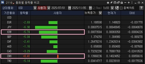 연합인포맥스 통화별 등락률 비교(화면번호 2116)에 따르면 원화는 달러화 대비로 지난 7월 이후 5.74% 떨어졌다.