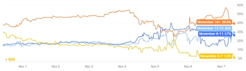 6일(현지시간) 각종 이벤트에 대한 베팅사이트인 폴리마켓을 보면, '언제 정부 셧다운이 끝나겠느냐'는 베팅에서 이달 8~11일과 12~15일은 각각 27% 및 30%로 집계됐다. 더하면 50%가 넘는 확률이다.
