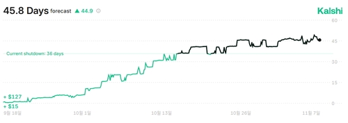 칼시의 '셧다운이 얼마나 지속되겠느냐' 베팅에서 셧다운 지속 기간은 대략 46일로 예측되고 있다. 이날로 셧다운이 37일째를 맞은 점을 고려하면 9일 후에는 셧다운이 끝날 것이라는 예상이다.