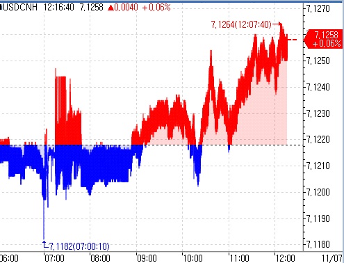 역외 달러-위안 환율은 오후 12시 16분 현재 전장대비 0.06% 오른 7.1258위안에 거래됐다.